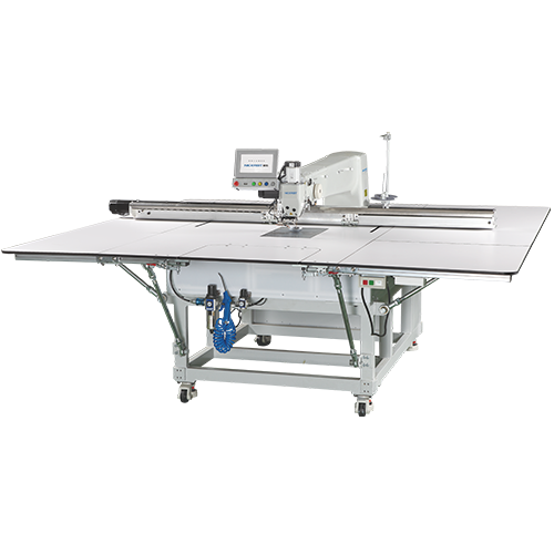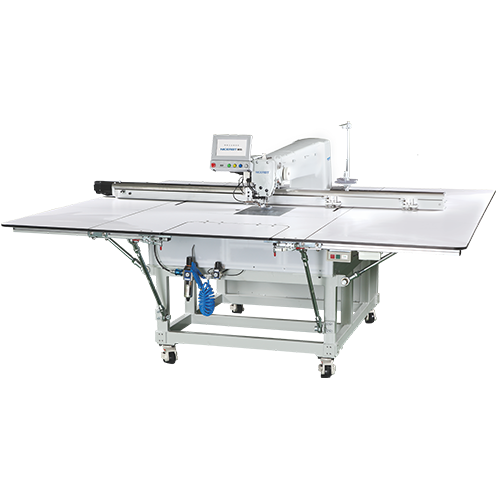 双丝杆、双导轨、双伺服电机机构,宽大的机座设计,机杆与机头部件无油润滑,旋梭油线微油润滑,剪线凸轮前置方便维修,新型模板夹紧装置,减少对气压的要求,可折叠台板方便搬运。